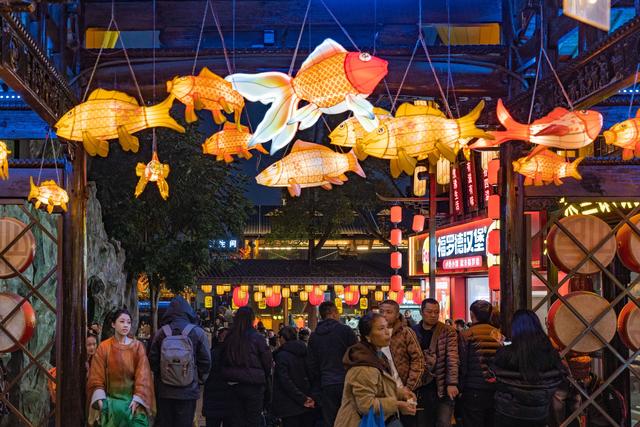 游客在木兰花乡(木兰不夜城)景区打卡国风主题活动渔灯节。