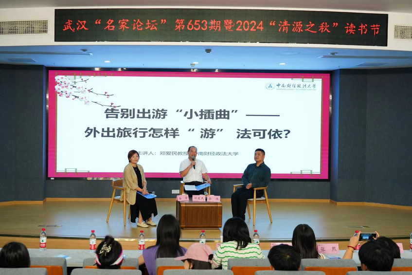 国庆长假旅游高峰即将到来,市民游客外出旅行时如何保障自己的权利?9月21日下午,武汉文旅普法轻骑兵校园行活动走进江汉大学,武汉“名家论坛”旅游专题讲座《告别出游“小插曲”——外出旅行怎样“游”法可依?》开启。中南财经政法大学旅游研究院院长邓爱民教授、湖北大晟律师事务所律师张伟、全国特级导游谷音分别从旅游收获、旅游指南、旅游维权及注意事项等方面,为200余名大一新生游玩出行提供全面的指导和建议。