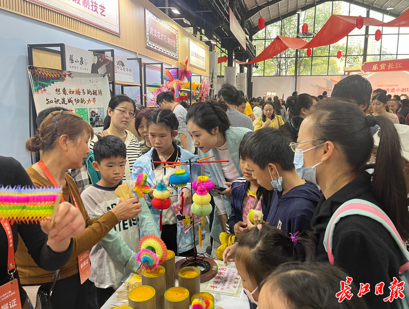 不少特色非遗让小朋友着迷。在天门纸花制作技艺展位前,一大群小朋友和他们的父母围在纸花周围,纸花在传承人手中不停地变换花样,如同玩魔术,小朋友们瞪大了眼睛,追问纸花怎么玩。在芜湖铁画锻制技艺展位上,一名小女孩干脆坐到了传承人的位置,在传承人手把手的指导下,挥起了铁锤,将白铁打平。然后传承人用工具将白铁掰弯,弯成一个个花瓣,不一会,一朵白铁梅花就成型了。