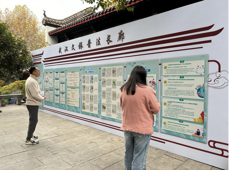 12月2日,在晴川阁景区,刚刚设置好的武汉文旅普法长廊成为一道独特的风景线,吸引了众多游客驻足。长廊中,《中华人民共和国文物保护法》的宣传内容丰富多样,精美的图片与简洁的条文解读相得益彰,让人们深刻领悟文物保护的重要性。“旅行中的普法小知识”,引来众多游客认真阅读着关于出游安全、权益维护等小贴士,现场学习氛围浓郁。