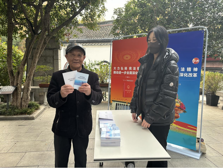 12月4日上午,在晴川阁景区,还设置了线下文旅普法宣传点。宪法宣传周的宣传海报,以通俗易懂的方式呈现,传递着宪法精神。来自晴川阁景区的“武汉文旅普法轻骑兵”宣传相关法律法规,发放《文化和旅游法律知识百问百答》《中国文物保护法》等普法资料。“什么是文物?”来自安徽的游客左先生在文旅普法长廊上找到了答案,“文物是不可再生的文化资源,受国家保护。”