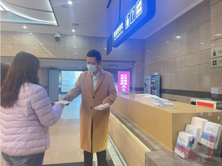 在八路军武汉办事处旧址纪念馆,工作人员向周边居民和来往行人发放普法宣传册。