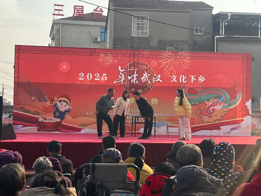 12月30日下午,市文旅局组织多家市属文化单位,在邻近仙桃市的蔡甸区三屋台村举办“年味武汉 文化下乡——四季村晚”迎春文化活动,三屋台村65岁的村民黄巧仙前来看戏曲小品演出,领春联福字。开展演出的“三屋台村百姓大舞台”,今年10月由市、区文化部门出资16万元建成,黄巧仙连声说这是政府给村里人办的一件大好事。
