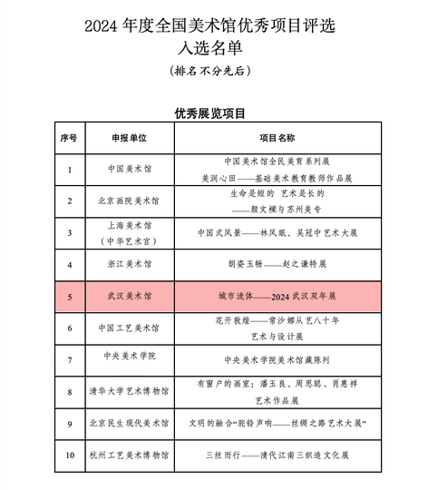 近日,文化和旅游部发布《文化和旅游部艺术司关于2024年度全国美术馆优秀项目评选入选名单的公示》,武汉美术馆“城市流体——2024武汉双年展”荣获文旅部2024年度全国美术馆优秀展览项目。全国仅有10个美术馆项目入选。
