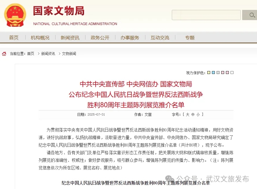 为贯彻落实中央有关中国人民抗日战争暨世界反法西斯战争胜利80周年纪念活动通知精神,用好文物资源,讲好抗战故事,弘扬抗战精神,汲取奋进力量,中共中央宣传部、中央网信办、国家文物局,于7月31日公布了纪念中国人民抗日战争暨世界反法西斯战争胜利80周年主题陈列展览推介名单。